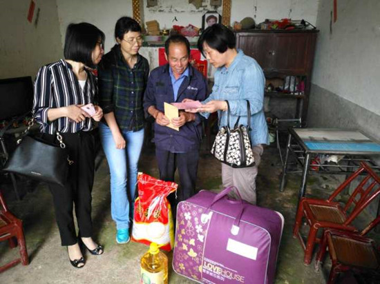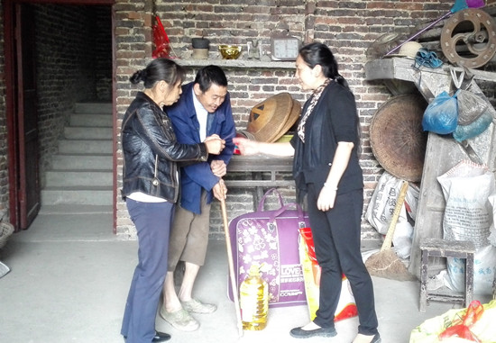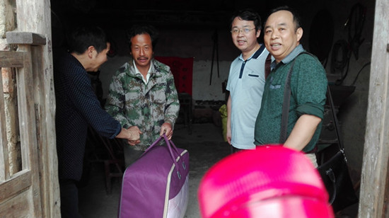 (数学与计算科学学院 供稿)6月6日,宣传部部长何文、数学与计算科学学院总支书记赵花云及党政办主任戴建宇、教育科学学院副院长刘丽群一行四人分别前往白泥村白燕组黄继光、碑头组王伏峰两户结对帮扶建卡贫困户家中,进行一进二访,精准扶贫。在70岁的黄继光老人家,何文一行送去了米、油、被子等慰问物资和2000元帮扶资金,并把本组的联系卡交到老人手中,告诉他有困难随时联系。在王伏峰家中,坐在轮椅上的老人家一见到我们,就两眼热泪盈眶,他本是任劳任怨的好劳力、自尊心很强的老党员,因为去年中风丧失劳动能力而致贫,突然的变故对他及其家庭打击很大。何文一行把2000元产业帮扶基金和我们的联系卡送给他,并为其家庭送来了慰问物资米、油、被子,鼓励他积极锻炼,争取能够早日生活自理。