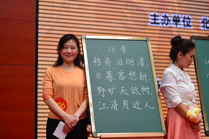 故事讲演环节,陈老师动情讲述了梅子涵老师的经典作品《走在路上》,让不少在场观众眼眶湿润;粉笔字展示环节,陈老师认真而专注的神情,漂亮端正的粉笔字让人印象深刻;而在才艺表演环节,一首原创词《画堂春·洞庭》的朗诵,一曲湘味浓郁的《八百里洞庭我的家》的演唱更是诠释了湖湘儿女的才情与风姿;课堂教学展示环节,是最能体现选手们的教学功底与专业素养的。短短三十分钟的课堂,陈老师将自己的教育理念与教学智慧融汇其中,浓浓的语文味儿,让现场掌声不断。紧随教学展示之后的现场答题,则是对选手知识与心理的双重考验。陈静老师凭借着自身扎实的文化素养从容作答,获得评委现场好评。