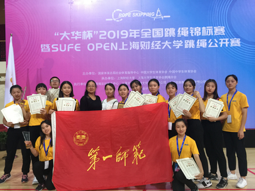 我校首次派出代表队参加了此项赛事,由体育学院院长黄依柱担任领队,党总支副书记祝娅和刘丽副教授担任主教练,参赛队员共13人。比赛过程中队员们充分展示出了刻苦训练的成果,奋力拼搏、配合默契,赛出了水平、赛出了风格,展示了一师学子的风采。经过两天紧张激烈的角逐,我校运动员在与世界跳绳冠军、世界纪录保持者的同场竞技中,不畏强手、勇于亮剑,最终个人绳规定套路中级荣获第二名,个人绳规定套路高级荣获第二名,交互绳花样规定提高套路荣获第二名,1分钟10人长绳集体跳荣获第三名,规定赛车轮基础荣获第三名,规定赛车轮提高荣获第四名,4X30秒单摇接力荣获第四名,3分钟10人长绳8字跳荣获第五名,交互绳花样规定基础套路荣获第八名的优异战绩,同时还获得“道德风尚奖”。