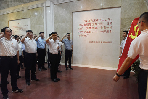 7月4日上午,省委副秘书长、省委政研室主任、省委财经办主任王晓科率省委政研室(省委财经办)全室在职党员干部来我校毛泽东与第一师范纪念馆开展“传承红色基因、发扬红色传统”主题党日活动,接受革命传统教育。校领导彭小奇、童小娇、刘志敏、李昱陪同参观纪念馆。