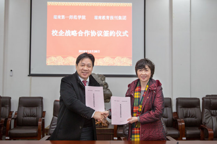 12月26日上午,我校与湖南教育报刊集团签署校企战略合作协议。湖南教育报刊集团党委书记、董事长张大伟、副社长、副总编龚鹏飞、中国教育报刊社湖南记者站副站长、湖南教育报刊社副总编李伦娥,我校校长童小娇、副校长江正云、宣传部、教务处、文学与新闻传播学院、美术与设计学院负责人及新闻教研室全体老师、学生代表参加了签约仪式。仪式由江正云主持。