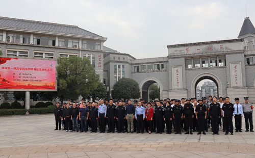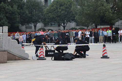 为全面落实湖南省长沙市公安局应急指挥中心反恐防暴工作规定,进一步加强我校师生安全防范意识,10月22日上午,我校反恐防爆应急演练活动于东方红校区东方红广场开展。高新区分局副局长曾健林、办公室主任刘勇、巡警大队副大队长柯鹏、反恐办肖明及我校副校长刘宇、保卫处副处长罗燕出席指导演练工作,我校数百名师生参加了演练活动