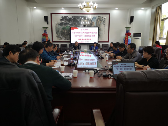 首先,校党委书记彭小奇传达了湖南省教育厅《关于学习贯彻习近平总书记关于国家网络安全“四个坚持”重要指示精神的通知》。然后,组织大家学习了中共中央总书记、国家主席、中央军委主席习近平对国家网络安全宣传周作出的重要指示,深入解读了国家网络安全工作“四个坚持”:要坚持网络安全为人民、网络安全靠人民,保障个人信息安全,维护公民在网络空间的合法权益;要坚持网络安全教育、技术、产业融合发展,形成人才培养、技术创新、产业发展的良性生态;要坚持促进发展和依法管理相统一,既大力培育人工智能、物联网、下一代通信网络等新技术新应用,又积极利用法律法规和标准规范引导新技术应用;要坚持安全可控和开放创新并重,立足于开放环境维护网络安全,加强国际交流合作,提升广大人民群众在网络空间的获得感、幸福感、安全感。
