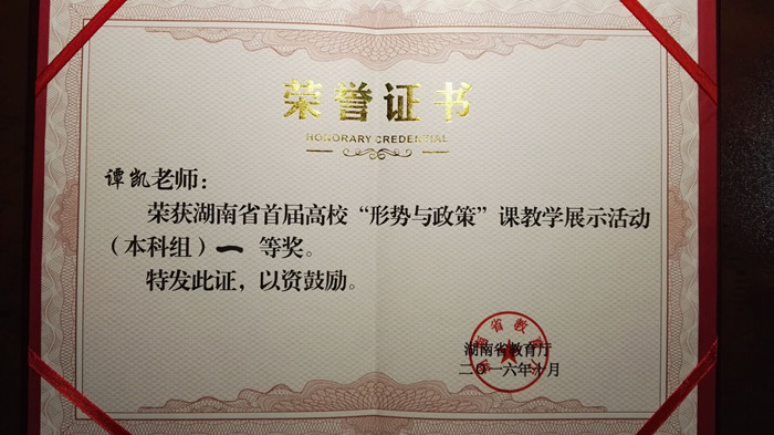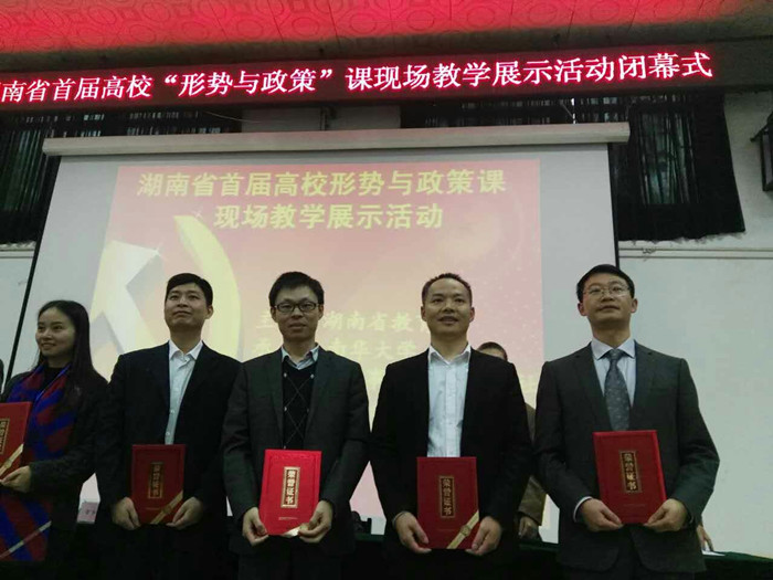 10月29日,湖南省首届高校“形势与政策”课现场教学展示活动在南华大学落下帷幕。我校马克思主义学院谭凯老师通过初赛、复赛和决赛层层比拼,获得(本科组)一等奖的佳绩。