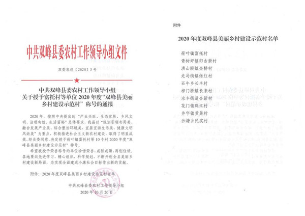 近日,双峰县委农村工作领导小组授予我校扶贫点石牛乡长丰村2020年度“双峰县美丽乡村建设示范村”称号。