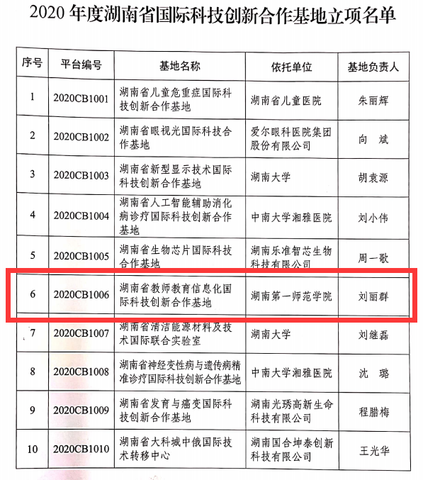 近日,省科技厅公布了10家省国际科技创新合作基地,我校教育科学学院刘丽群教授牵头负责的“湖南省教师教育信息化国际科技创新合作基地”成功入选,这是我校首个省级国际科技创新合作基地。