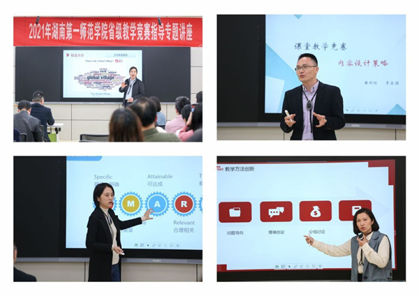 外语课程思政教学竞赛国赛评委刘明东在讲座中结合具体课程典型案例进行分析,现场展示如何精准挖掘课程中的思政元素、实现有机融合。省级外语课程思政教学比赛一等奖获得者陈喜贝结合自己的参赛经历,就文本解读、目标设定、活动开展、教学评价四个方面进行了具体讲解。省级“教学能手”、省级高校教师课堂教学竞赛一等奖获得者李金国和邵馨颖分别围绕课堂教学竞赛的内容设计策略、教学方法及手段创新两个主题进行了详细介绍。讲座现场座无虚席,老师们均表示收获满满。