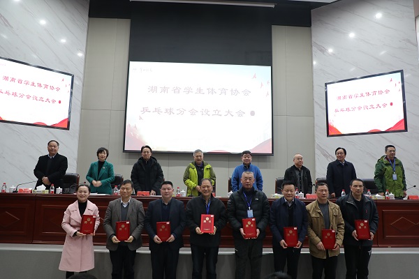 王柯敏、葛洪元、王瑰曙、彭小奇共同为湖南省学生体育协会乒乓球分会揭牌。随后,大会为会长单位和副会长单位授牌,并为会长、副会长、秘书处主任颁发聘书。