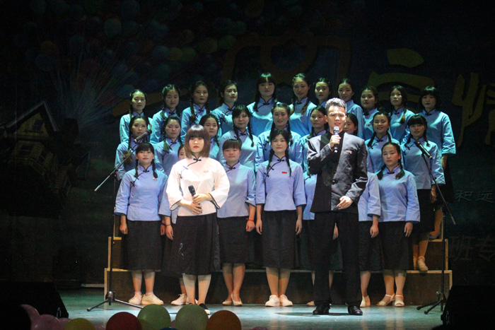 演出在开场爵士舞《Up And Down》的火爆氛围中拉开了序幕。演出通过歌曲、舞蹈、话剧、走秀等丰富多彩的形式,紧扣文科学生专业特色,穿插微博互动、随机抽奖环节,充分体现了同学们的精巧用心。其中,古韵十足的鼓舞《相和歌》,将古典诗歌与民族舞蹈完美结合,尽显传统文化的无穷魅力。童话剧《七只淘气的小鸡》表演生动,寓教于乐,引人深思。爵士舞《bang bang bang》男女演员配合默契,动感十足,展示出超强的舞台表现力和感染力。走秀节目《冰菊物语》更是惊艳全场,身着旗袍或中山装的男女演员,令观众仿佛置身于民国时代,随手展示的学生优秀书画手工作品,彰显了小学教育专业学生扎实的专业技能。小学教育教研室老师们献上的合唱《明天会更好》感情真挚,唱出了对同学们未来的祝福,寄予了殷切的期望。由长沙市理工大学子弟小学校长余丽英带来的独唱《报答》饱含深情, 表达了对母校的感恩。最后,民歌合唱《相亲相爱》质朴激昂,用动人的歌声为本次演出画上了圆满的句号。