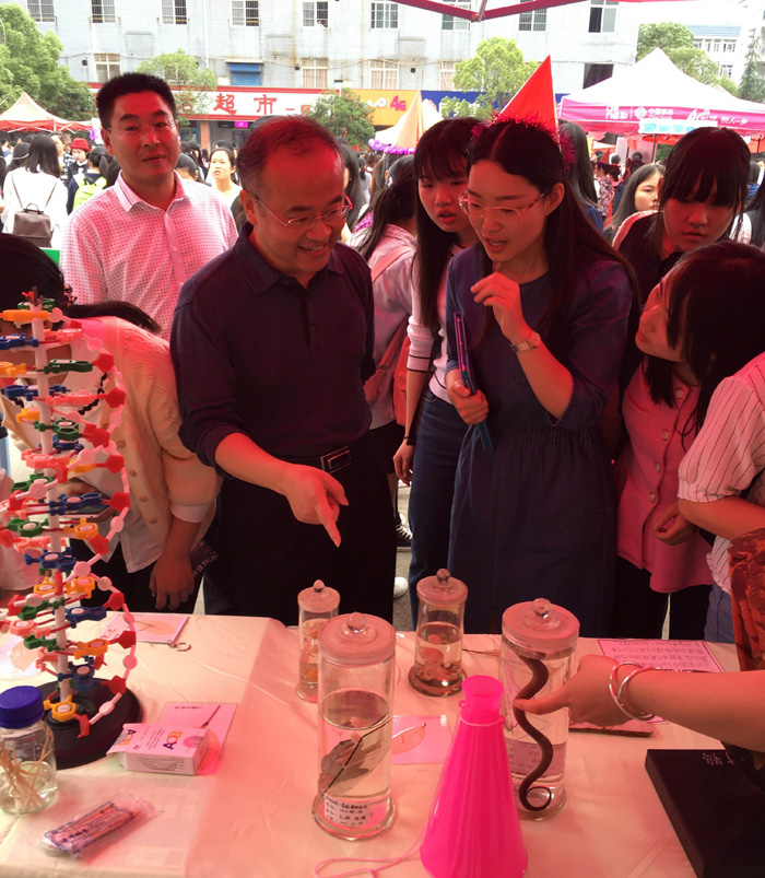 18日中午,科技成果展在学生文化广场举行。校党委书记彭小奇、副校长刘宇等领导兴致勃勃的参观了展览并给予了高度评价。成果展分为物理馆、化学馆、生物馆三个展馆,展出了科教专业学生200余件科技制作作品和科普知识宣传板。展览现场,五个充满创意和特色的实验与通关游戏,吸引了众多同学参与互动,让大家在游戏中走近科学。