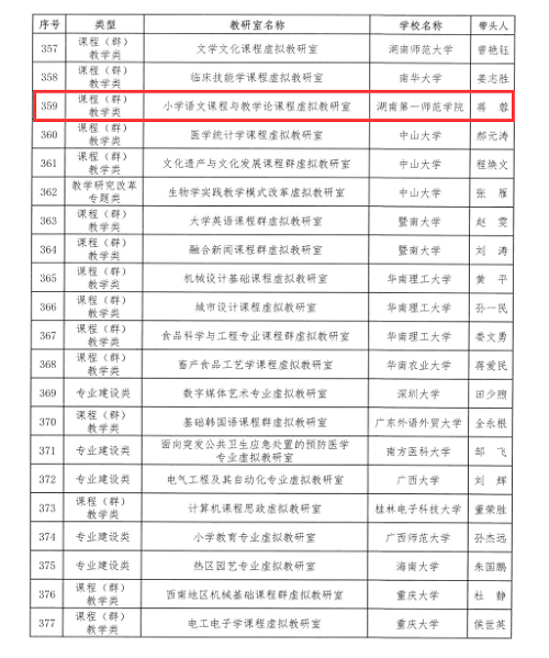近日,教育部办公厅公布首批虚拟教研室建设试点名单,我省7所本科高校的13个虚拟教研室入选,我校蒋蓉教授领衔的“小学语文课程与教学论课程”虚拟教研室位列其中。