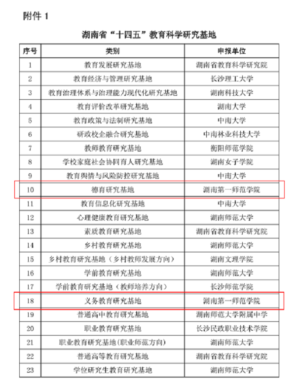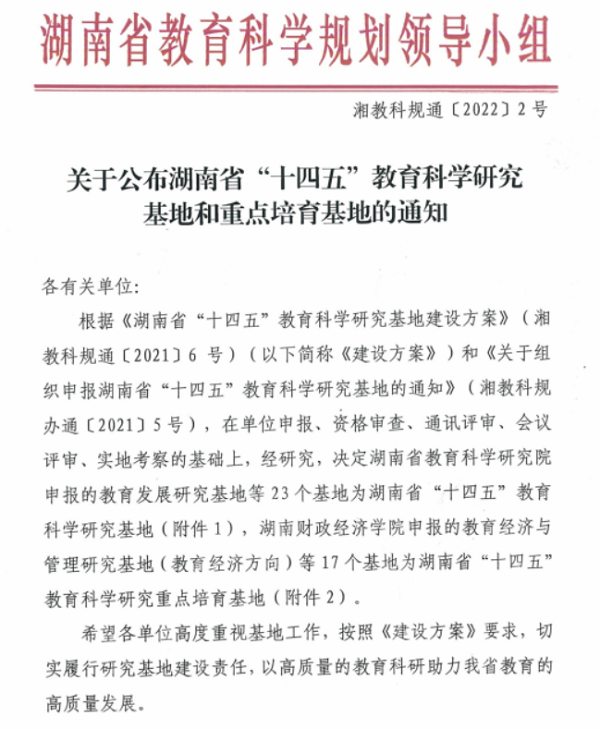 近日,湖南省教育科学规划领导小组公布了湖南省“十四五”教育科学研究基地名单,全省14家单位的23个基地获批,我校“德育研究基地”“义务教育研究基地”均位列其中,获批基地数量排名全省第四,仅次于湖南师范大学、中南大学、湖南省教育科学研究院。