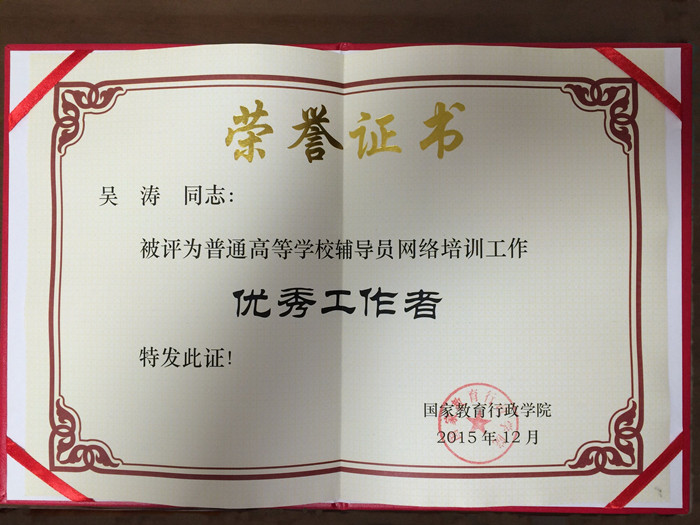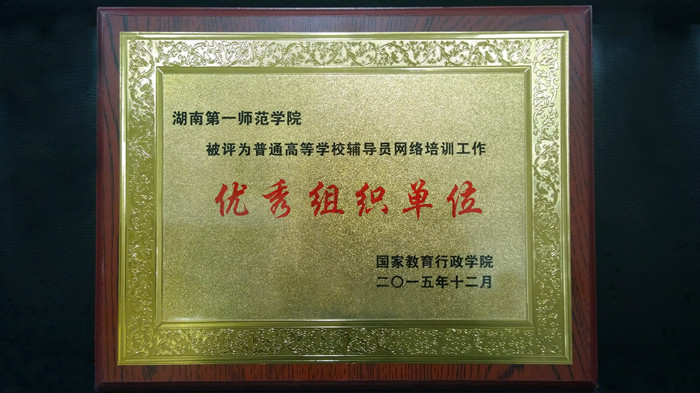 2015年12月26日—30日,2015年全国普通高等学校辅导员队伍建设研讨班暨辅导员网络培训总结会在国家教育行政学院举行,来自全国108所高校共计220余人参加了会议。我校学生工作处学生管理科科长吴涛参加了会议。在此次会议上,我校被评为“普通高校辅导员网络培训优秀组织单位”(湖南省仅我校获得此荣誉),吴涛荣获“普通高校辅导员网络培训优秀工作者”荣誉称号。