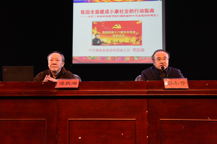 谭跃湘教授以“我国全面建成小康社会的行动指南——学习《中共中央关于制订国民经济十三五规划的建议》”为题,紧密联系湖南省发展实际,结合自己长期研究和独到思考,从我国经济社会发展的大背景、我国经济社会发展的大思路、我国经济社会发展的大举措等三个方面,全面系统地宣讲了全会精神,对经济社会发展中的“新常态”、“五大发展理念”、“六个坚持”等重点问题进行了深刻阐述。报告主题鲜明、内容丰富、分析透彻、深入浅出,对全校师生深刻领会全会精神、有力推动工作开展具有重要指导作用。