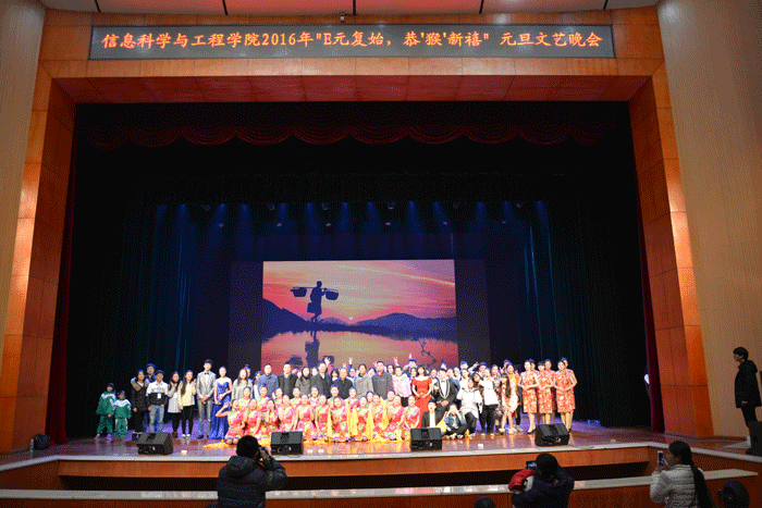 晚会在青春飞扬的爵士舞《Dark horse》中拉开序幕。创意十足的暖场片简要回顾了信息科学与工程学院师生在2015年取得的累累硕果,并向大家送上了2016新年的祝福。接下来,各班级、各艺术团体精心编排的精彩节目炫丽登场:古朴悠扬的舞蹈《古韵》、《茶韵巴山》将大家引入高山流水、婀娜起舞的民族意境;优美动听又发人深思的音乐剧《别爱得太迟》,风趣幽默又意味深长的小品《签约》、《梦想演奏曲》生动诠释了当代大学生追逐梦想的激情和时刻不忘“百善孝为先”的美德;耳熟能详的歌曲串烧《陪你度过漫长岁月》、活力四射的韩舞《Girls Girls Girls》以及学校谷雨乐队带来的歌曲演奏,带领同学们重回那追剧、追星的青涩时光;最后,晚会在欢快喜庆的集体舞《今日苗乡歌最多》中缓缓落下帷幕。晚会现场还布置了微信墙,开设了微信互动抽奖环节,老师、同学们纷纷通过微信传递祝福、分享欢乐。