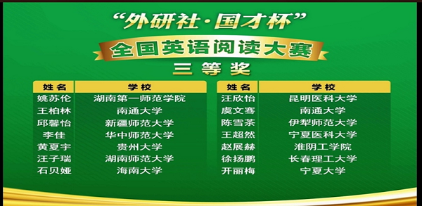 “外研社·国才杯”全国英语演讲、写作、阅读大赛已连续五年入选教育部中国高等教育学会发布的“全国普通高校大学生竞赛榜单”,也是入选该榜的唯一外语类赛事。我校学子连续两年进入全国阅读决赛并获奖。他们与北大、复旦、北外等一流名校学子同台竞技,充分展示出扎实的外语语言基础和良好的精神风貌,也体现出我校外语人才培养的良好成效。