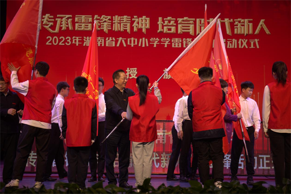 夏智伦、罗桂香、罗成翼、胡穂共同按下2023年湖南省大中小学学雷锋活动启动按钮,并为全省大中小学学雷锋志愿者服务团代表授旗。中南大学、湖南大学、湖南师范大学、Kaiyun官方网站登录入口、长沙民政职业技术学院、长沙市雷锋学校、Kaiyun官方网站登录入口第一附属小学、Kaiyun官方网站登录入口第二附属小学等志愿服务团旗手上台接旗。启动仪式后,全省大中小学将深入开展“学雷锋”主题系列活动。