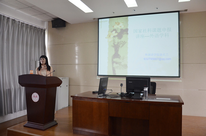 9月15日下午,外国语学院教授涂兵兰博士应科研处邀请,在外国语学院同声传译实验室为外国语学院和公共外语教学部的教师作了一场题为“国家社科基金课题申报——外语学科”的讲座。讲座由外国语学院院长刘祥清主持,科研处处长赵奇钊出席讲座。
