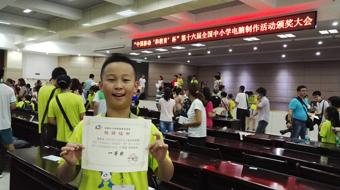 “全国中小学电脑制作活动”自2000年起每年举办一届。本届活动更是吸引了来自全国各地大批爱好电脑制作的学生,全国共有超过500万学生直接参与。田景天同学参加的电脑绘画比赛,分为技术测试、面试答辩和颁奖仪式三个环节。尽管参赛人员众多,对手强大,但他依然不负众望,一路过关斩将,成为电脑绘画组8个全国一等奖中的一员。