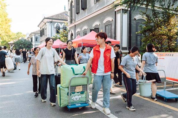 校园内,随处可见护卫队、志愿者在各个路口、广场、食堂、宿舍楼站点,提供“一对一”服务。校团委还在大门、国基广场、校内各大交叉路口等地,分设迎新服务站和机动组。服务站为新生答疑解惑,提供矿泉水、菊花茶和纸巾等,还可以帮助新生看管物品,每当有新生经过,志愿者会主动上前,关心新生需要,帮助新生指引方向。机动组志愿者流动性较大,在各处皆有分布,志愿者们帮新生用小推车托运行李,带领学生熟悉报到地点和寝室,一路上解答新生的疑惑,并和新生们聊天,让新生少了些许紧张与无措,多了份温暖和感动。