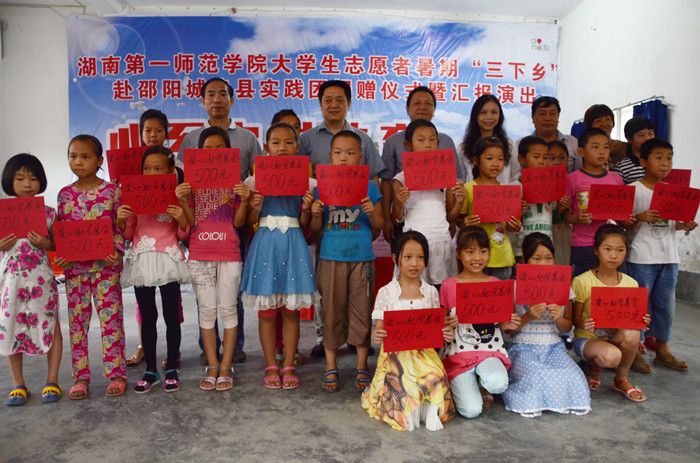 7月16日下午,我校文学与新闻传播学院“情系清溪”爱心捐赠仪式暨汇报演出在邵阳城步县儒林镇中心小学隆重举行。校长肖湘愚、校团委书记任晓晴、文学与新闻传播学院党总支书记林光明、城步县县长杨映林、县教育局局长李德帮、儒林镇中心小学校长肖远清、副校长兰朝红等出席此次活动。