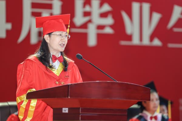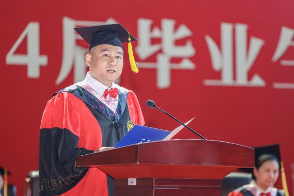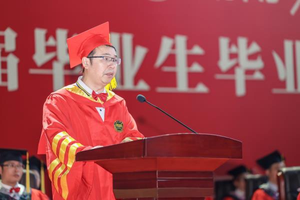 胡穗代表学校向2024届毕业生表示热烈的祝贺和美好的祝愿,向为他们成长成才付出辛劳的各位老师和家长,致以衷心的感谢和崇高的敬意。他深情回顾了毕业生在校的成长历程,四年前,同学们选择了一师,融入了一师,也助力了一师的发展。四年来,师生一起见证了学校第二次党代会的胜利召开,见证了“四个一师”新篇章的徐徐展开,见证了学校日新月异的发展变化,尤其荣耀的是,见证了习近平总书记来校考察的重大历史时刻。作为一师学子,在中国式现代化建设新征程中,要牢记好、领会好、践行好习近平总书记的殷殷嘱托。胡穗叮嘱同学们:一要争做爱国奉献的新青年,立志报国强国。向优秀校友学习,无论身处什么岗位,都能够胸怀报国强国之志,将个人理想融入国家发展,在最美的事业中绽放青春,在为祖国、为人民的服务中更好地实现人生价值。二要争做不懈奋斗的追梦人,勤于终身学习。在社会这个大课堂中汲取更多学识智慧,锤炼更加过硬本领,让不懈奋斗成为人生最鲜明的底色,让终身学习成为改变人生长度、拓展人生宽度、增加人生厚度的一种生活方式。用本领托举梦想,用奋斗开创明天。三要争做勇立潮头的开拓者,勇于创新创造。牢记校训“要做人民的先生,先做人民的学生”,俯身躬行,向人民学,向实践学,在实践中获得创新创造的灵感和动力;牢记校风“实事求是,不自以为是”,不固步自封,不随波逐流,在各自领域乘风破浪、勇立潮头;拿出毛主席当年“我们不干,谁干?”的勇气与魄力,主动拥抱新时代,抓住新机遇,找寻和探索属于自己行业的新属性、新联系、新规律,奋力创造不一样的未来。