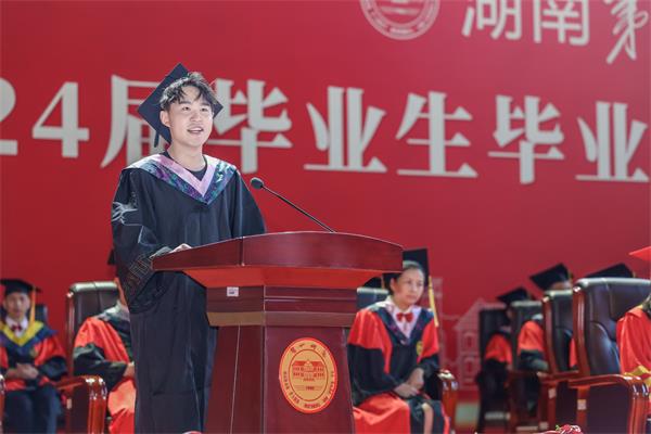 体育学院李梦龙教授作为教师代表发言;教育学院2024届毕业生胡坤作为优秀毕业生代表发言。