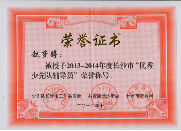 近日,共青团长沙市委授予我校第一附属小学“2013—2014年度长沙市优秀少先队集体”光荣称号,授予一附小大队辅导员赵梦婷老师“2013—2014年度长沙市优秀少先队辅导员”光荣称号,并对一附小的少先队工作给予了充分肯定和高度评价。
