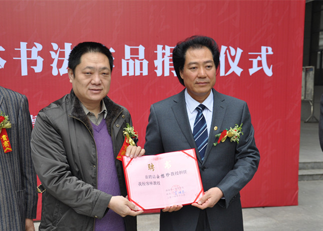 仪式上,安想珍先生向我校捐赠了自己精心创作的毛泽东诗词长卷毛体书法作品;肖湘愚代表学校向安先生颁发了作品收藏证书和客座教授聘任证书,并发表了重要讲话。肖湘愚高度评价了安想珍先生的艺术成就,并表达了全校师生对安先生的诚挚谢意。