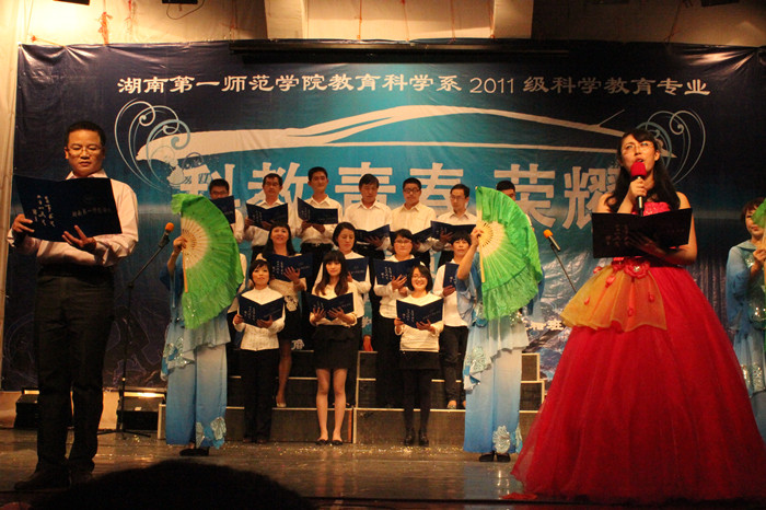 “因为科教,所以兴国;因为科教,心心相守”,汇报演出在2011级科学教育1班的班歌《因为科教》合唱中落下帷幕。
