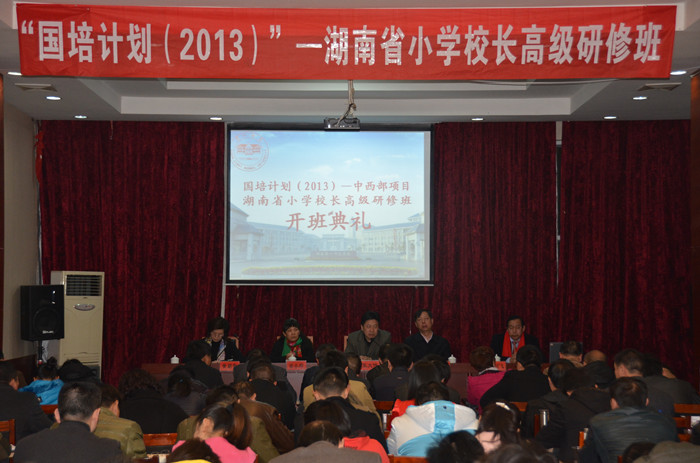 12月11日上午,“国培计划(2013)”——中西部项目小学校长高级研修班开班仪式在我校隆重举行。湖南省教育厅师范处处长张大伟,我校副校长李克勤,校国培项目办主任、继续教育部主任曾小玲,首席专家彭剑飞,校国培项目办副主任、继续教育部副主任黄朝霞出席并在主席台就坐,培训班班主任、教务秘书以及来自全省各地100名小学校长参加了开班仪式。开班仪式由黄朝霞主持。