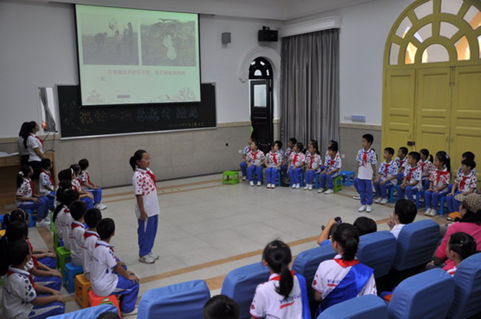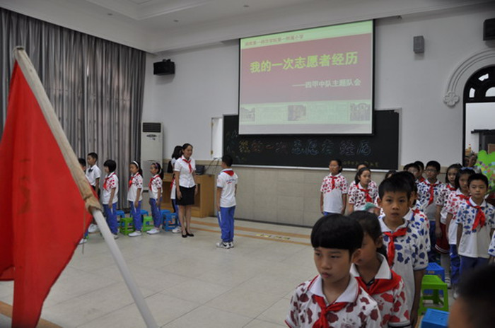 赵雪峰一行首先来到一附小多功能教室,观摩了由四甲中队辅导员喻老师和少先队员们自主设计、精心组织的中队主题队会——“我的一次志愿者经历”。此次队会以“我的一次志愿者经历”为主题,从志愿者的概念引入,由孩子们分享假期中难忘的爱心志愿服务经历。队员们通过看视频、听介绍,展开了热烈的讨论,从而更加深刻地理解了志愿者的精神实质即为“奉献”。紧接着,中队的四支雏鹰小分队以幻灯片的形式分别展现了队员们的志愿经历。最后,全体中队队员们在中队辅导员的带领下,庄重宣誓,表达要努力争做乐于助人、传递正能量的阳光少年,为实现幸福美丽的中国梦而贡献力量的志愿!