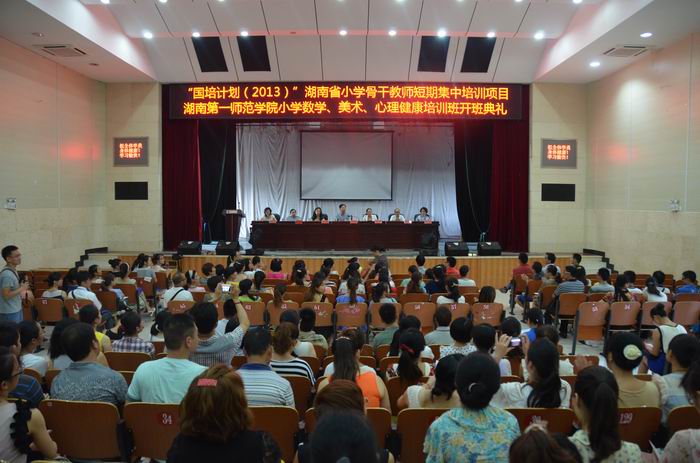 8月28日上午,“国培计划(2013)”湖南省小学数学、美术、心理健康教师短期集中培训项目在我校正式开班。我校副校长李克勤,校国培办主任、继续教育部主任曾小玲,数学系主任、首席专家阎颖,美术系副主任、首席专家范迎春,教育科学系心理健康学科首席专家彭剑飞、朱丹,校国培办副主任、继续教育部副主任黄朝霞出席开班典礼并在主席台就坐。开班典礼由黄朝霞主持。