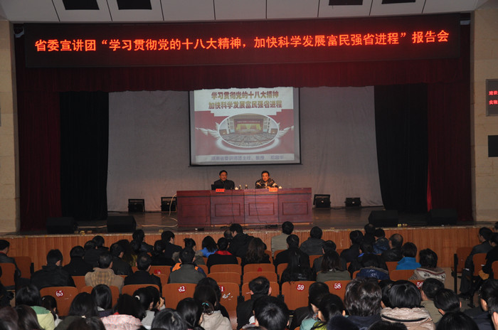 12月13日上午,省委宣讲团在我院举行“学习贯彻党的十八大精神,加快科学发展富民强省进程”报告会。省委宣讲团成员、省委讲师团主任郑昌华教授作报告。院党委书记詹小平主持报告会。全体院领导、副科以上干部、副高以上职称人员、教研室主任、辅导员以及学生代表共300余人聆听报告。