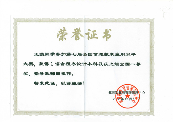 12月18日,由教育部教育管理信息中心主办的“中国航信杯”第七届全国信息技术应用水平大赛全国决赛在北京大学落下帷幕。我院信息科学与工程系09计科班学生王璇、罗阳旭经过预赛和复赛的层层选拔,最后在全国决赛中分别荣获“C语言程序设计本科及以上组”一等奖和二等奖,田祖伟老师荣获“最佳指导教师奖”。
