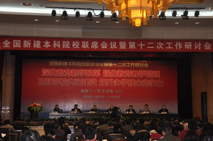 11月28日上午,由我院承办的全国新建本科院校联席会议暨第十二次工作研讨会在湖南宾馆隆重开幕。中共湖南省委副书记梅克保、省委教育工委书记、省教育厅厅长王柯敏、教育部教师工作司副司长葛振江等领导出席开幕式并讲话。来自全国25个省(直辖市、自治区)的82所新建本科院校的书记、校长、专家以及我院院领导、各部门负责人、教师代表共400余人参加了开幕式。开幕式由盐城师范学院党委书记成长春主持。