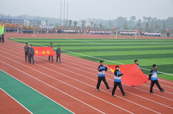 崭新的体育运动场在清新的雨水洗刷后显得格外耀眼、清晰。初冬季节,虽然有了几许寒意,但挡不住师生们运动的热情。8时30分,开幕式正式开始。伴着激越、雄壮的运动员进行曲,国旗方阵、校旗方阵、彩旗方阵、裁判员方阵以及全院10个系部运动员方阵依次从主席台通过,步伐一致、口号震天,红色的跑道上绘饰出最美的青春靓影。
