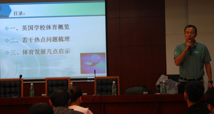 10月16日下午,华中师范大学黄爱峰教授作了题为《英国学校体育概括及启示》的专题讲座。黄教授从英国与中国体育活动比较的角度,对英国学校的体育教学情况进行了介绍,并提倡我们从不同的角度去思考问题,使大家开阔了视野,活跃了思维,受益匪浅。