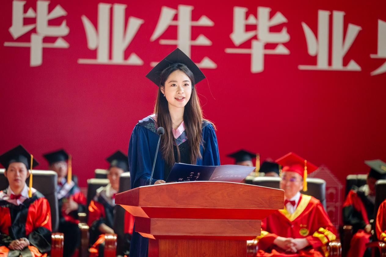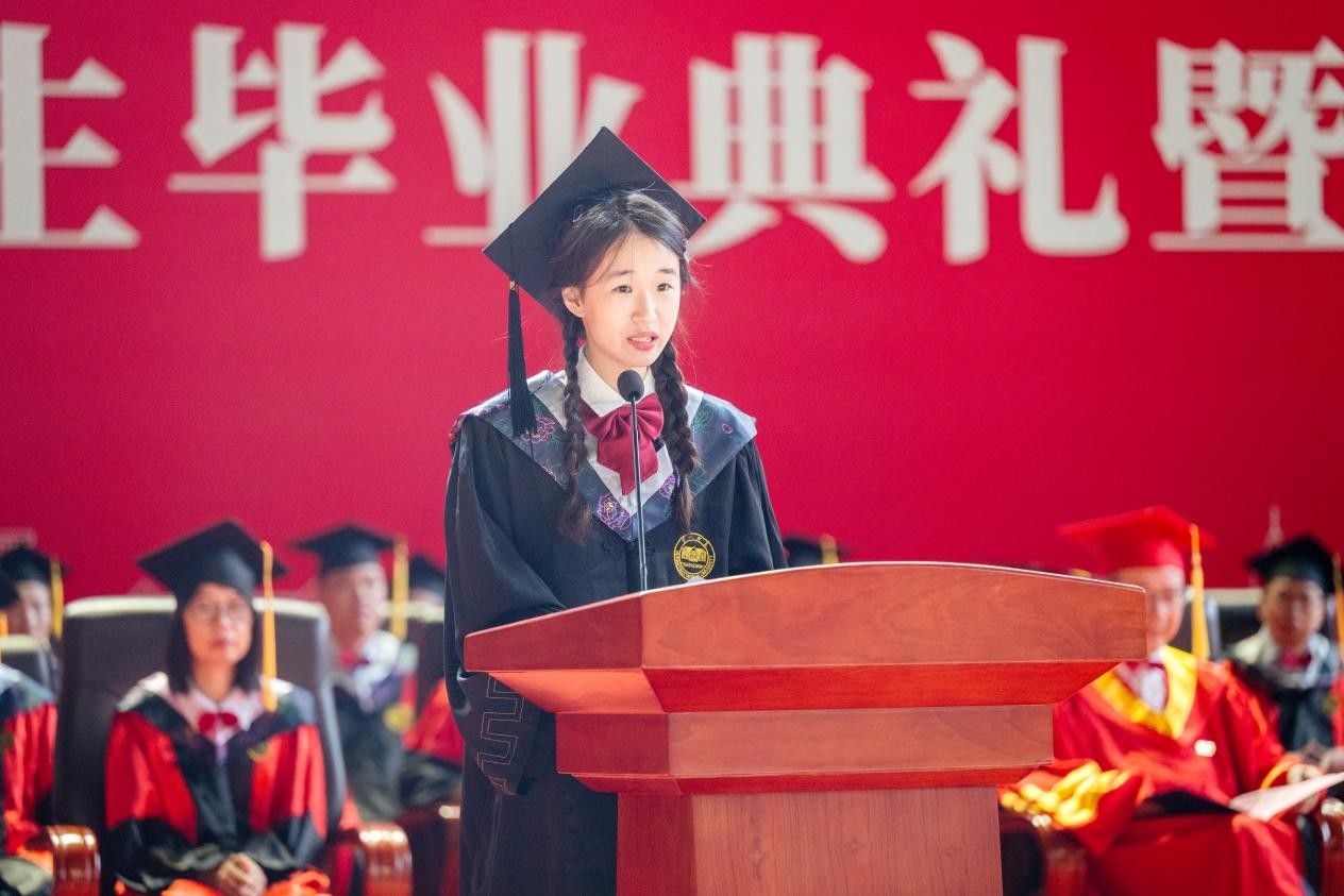在热烈的掌声中,罗成翼代表学校致毕业贺辞,向即将奔赴祖国各地建功立业的2025届毕业生表示热烈的祝贺和美好的祝愿,向为他们成长成材付出辛劳的各位老师和家长,致以衷心的感谢和崇高的敬意。2025届毕业生是学校“一四”战略全面实施的首届毕业生,是承载着特殊使命的一届学生。罗成翼深情回忆了毕业生在校期间践行办学新理念、共同见证和创造学校跨越式发展的一个又一个高光时刻,重温了习近平总书记亲临学校视察时的殷切嘱托,以及百廿校庆的荣耀,学校办学层次实现历史性突破的自豪,考研录取率从6.39%跃升至22.24%、招生规模扩大但录取分数线却稳居高位的欣慰,还有一师红墙、新体育馆、新工科楼、新宿舍楼等文脉味与现代风交融的校园新地标拔地而起、学习生活环境不断优化的幸福。