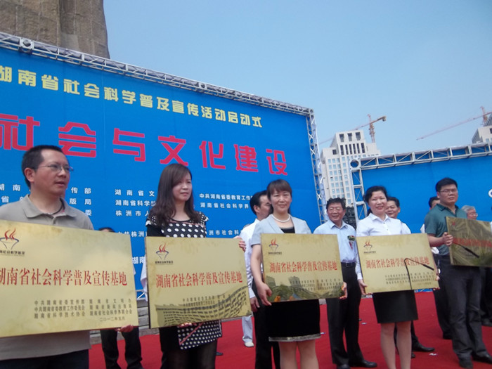 启动仪式上,省社会科学普及宣传活动组委会表彰了2011年全省社会科学普及工作先进和湖南省第二届优秀社会科学普及读物,并为我院青年毛泽东纪念馆等9家湖南省首批社会科学普及宣传基地授牌。青年毛泽东纪念馆馆长艾建玲教授、颜蒹葭老师应邀出席了活动启动式。