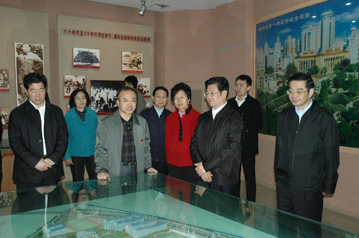 在纪念馆第五展室,王兆国一行听取了我院彭小奇院长关于东方红校区建设、学院办学与发展情况的汇报并作了重要指示。王兆国说:第一师范是毛泽东主席的母校,主席曾在此学习、工作了八年,并亲笔为母校题写了校名。学校历史悠久,文化底蕴深厚,素有“千年学府,百年师范”的美誉,培养和造就了一大批名人。新中国成立后,第一师范一直致力于基础教育师资的培养,更是呈现出勃勃生机,在培养教育人的人的工作中,这些年来,第一师范不仅办学规模扩大了,而且人才培养的质量也很高,涌现出了一大批的名人、名师、名家,形成了自己的特色和品牌,这里凝聚着第一师范历届校领导的心血和智慧。衷心希望第一师范学院全体教职员工继续发扬学校光荣传统和优良作风,为党和国家培养更多更优秀的人才,为全国的基础教育做出更大的贡献。
