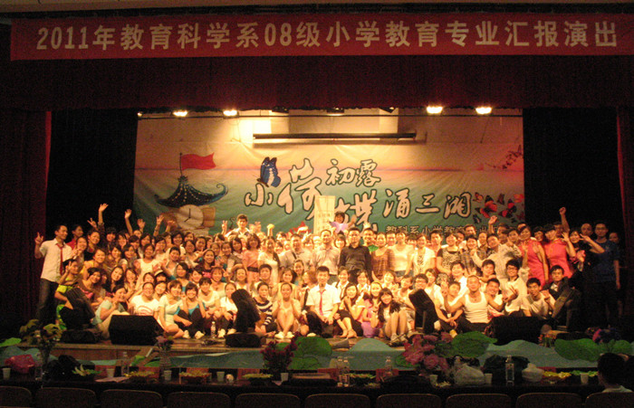 教育科学系08级小学教育专业189名学生共同筹划的这场专业汇报演出以“小荷初露,蝶涌三湘”为主题,以学生的成长足迹为主线,分为“小荷尖尖”、“锋芒初露”、“破茧成蝶”、“涌动三湘”四大篇章。构思精巧,场景绚丽,形式多样、充满新意,给观众带来了一种全新的视觉和听觉感受,充分展示了08级小学教育专业学生扎实的专业功底和良好的职业风采。