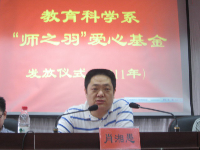 5月19日下午,我院教育科学系“师之羽”爱心基金发放仪式在东方红科技楼演播厅隆重举行。院领导肖湘愚、刘鸿翔以及党委宣传部部长陈志武、学生工作处处长何文、团委书记任晓晴、教育科学系主任彭小虎、副书记袁向荣、副主任王建平等应邀出席了仪式。