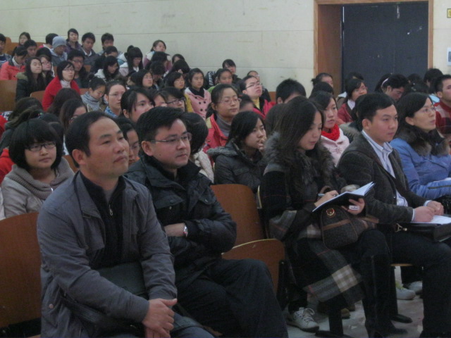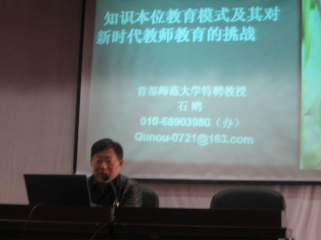 石教授从中西教育的对比尤其是我国与美国教育的对比中引导大家认识我国教育存在的问题与差距。这种不足主要表现在高科技领域的落后与原创力的匮乏,这很大程度上是与我国学校教育中长期以来实施以知识本位教学模式相联系的。知识本位教学模式过于重视知识的传授,忽视能力的提升与情感、价值观的养成;过于重视对书本知识的掌握,忽视对其他知识的获得与汲取;而且实施的是一种被动的授受式的教学方式,忽视了学生的主动性、创造性。基础教育课程改革提出要改变原来课程的“繁、难、偏、旧”的状态,需要实施探究发现式的教学方法,强调课程教学目标的知识维度及情感、态度、价值观等维度的达成。石教授以其对学校教育的真知灼见,以及对教育现实的深入思考,并用鲜活的教育实例来加以论证,使学生们充分感受到石教授学术研究的广博精深,人格修养的高端魅力,同时也使莘莘学子们陡然升起了对未来小学教育的深沉的责任感与事业心。最后,石教授还对同学们提出的若干问题进行现场解答,互动交流