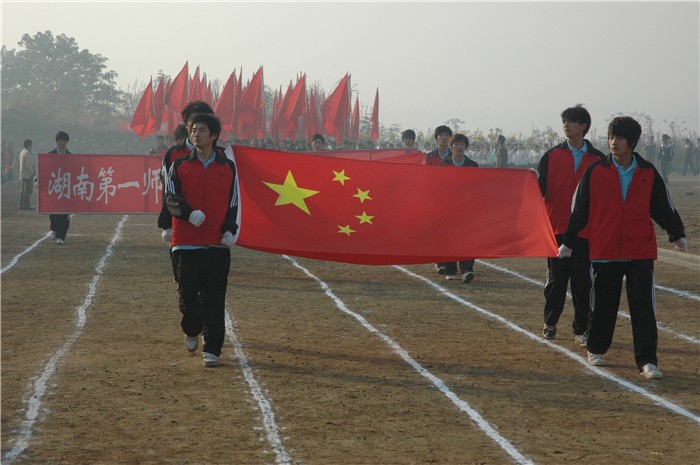 国旗方阵、校旗方阵、会标方阵、彩旗方阵、彩球方阵、裁判员方阵、运动员方阵、啦啦队方阵等26个方阵依次出场。口号嘹亮,气势磅礴,整个田径场沸腾着年轻的血液,踏出了时代的最强音。