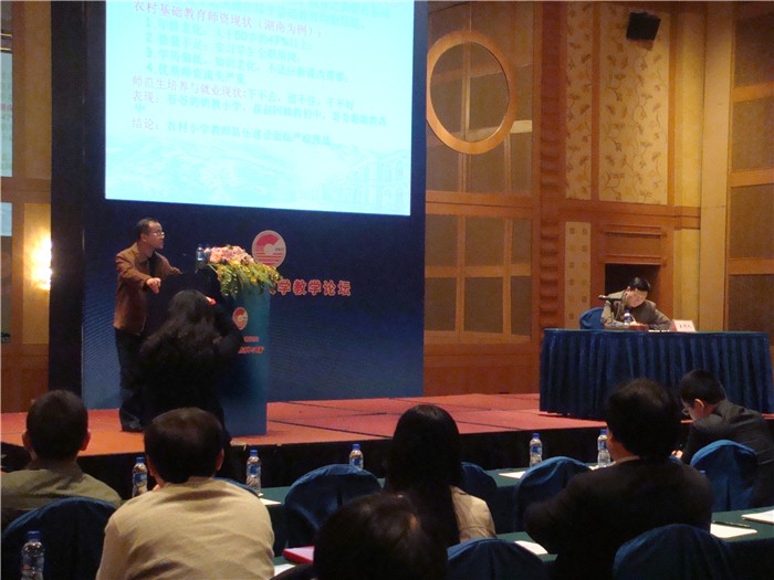 随后,彭小奇院长从“小学教师培养模式的历史回顾”、“目前小学教师培养中存在的问题与困难”、“小学教师培养模式的改革与创新及“初中起点六年制本科学历小学教师培养的政策措施与初步成效”等四个方面论述了实施六年制小学教师教育的必要性、可行性及其特点、优势和成效等。