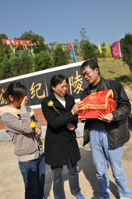 10点30分,骨灰安葬仪式开始,在场的来宾为晓雨默哀三分钟,气氛肃穆而凝重。随后,省红十字会救护部杨部长将“无偿捐献人体器官”的荣誉证书郑重的送到了晓雨爸妈的手上,匡爸爸和匡妈妈抑制不住内心的悲伤,紧紧抱着晓雨的骨灰盒,顿时泪水纵横。