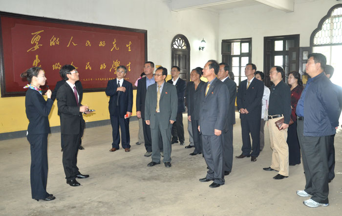 参观团所有成员胸前佩戴着彩色的金正日像章,此次来长主要参观中共湘区革委会旧址、青年毛泽东纪念馆、岳麓山爱晚亭、岳麓书院、花明楼刘少奇故居等红色景点。他们对我院青年毛泽东纪念馆特别钟情,个个认真听取讲解员和翻译的精彩讲解,非常高兴地参观了每个景点,有的还边听边认真作记录。特别是在当年毛泽东求学的八班教室,客人们依次坐在主席当年的座位上留影纪念,有的客人将镜头对准八班同学的合影寻找