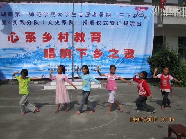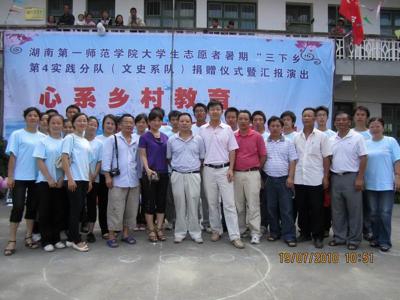 此次“三下乡”社会实践由文史系党总支陈天涯副书记、学工办邹华秀主任、教务办李希光主任亲自带队,有文史系、信工系、外语系等十八名志愿者参加,在湖南省桂东县新坊乡溪源小学开展了为期十天的支教 、调研、助学等一系列社会实践活动。