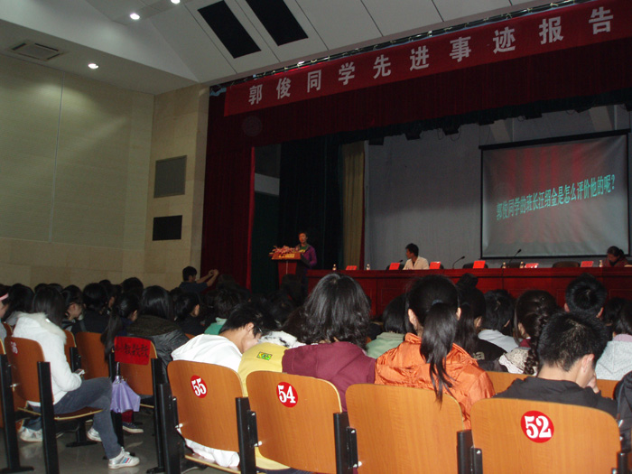 报告会上,郭俊同学详细地叙述了当天奋勇救人的情形,言语朴实,字字真情。没有太多谈及自己救人的壮举,但我们读懂了他平凡的人生。郭俊说,他是吃百家饭长大的孤儿,在自己平凡的人生道路上曾得到过很多人的帮助,像救人这件事只是自己该做的事,一件对得起自己良心的事。从郭俊的讲话中,我们看不出他丁点成为名人后的自豪,有的只是一份对生活的执着及朴实的性格。他一再声称自己是个幸运儿,社会给予了他太多的关怀,他应该感恩,感恩社会和社会上的每一个人。